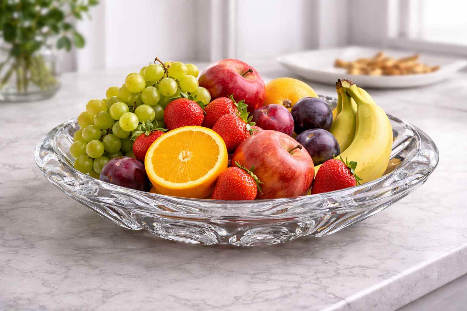 Это не просто фруктовница — это произведение искусства, вдохновлённое самой природой. Завораживающий узор в виде волн, расходящихся по поверхности, будто имитирует движение воды. Свет, проходящий сквозь рельефный хрусталь, играет на изгибах, создавая переливы и тени. Блюдо выглядит живым, динамичным, как будто оно дышит в такт с пространством.