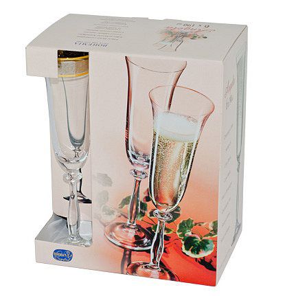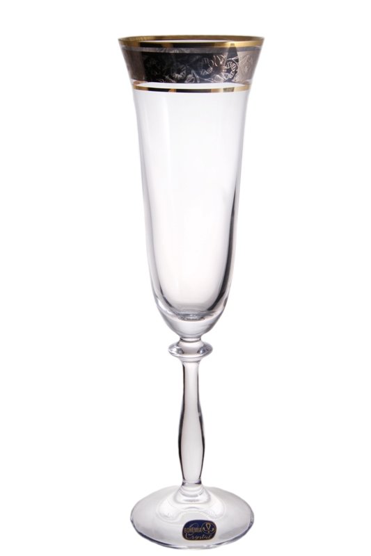 Бокалы для шампанского Angela с деколем объёмом 190 мл на 2 персоны — это изысканное сочетание классической формы и декоративной роскоши. Вытянутая чаша типа флюте идеально подчеркивает лёгкость и игру пузырьков игристого напитка, а декорированный ободок с золотистым узором придаёт бокалу выразительный и торжественный вид.