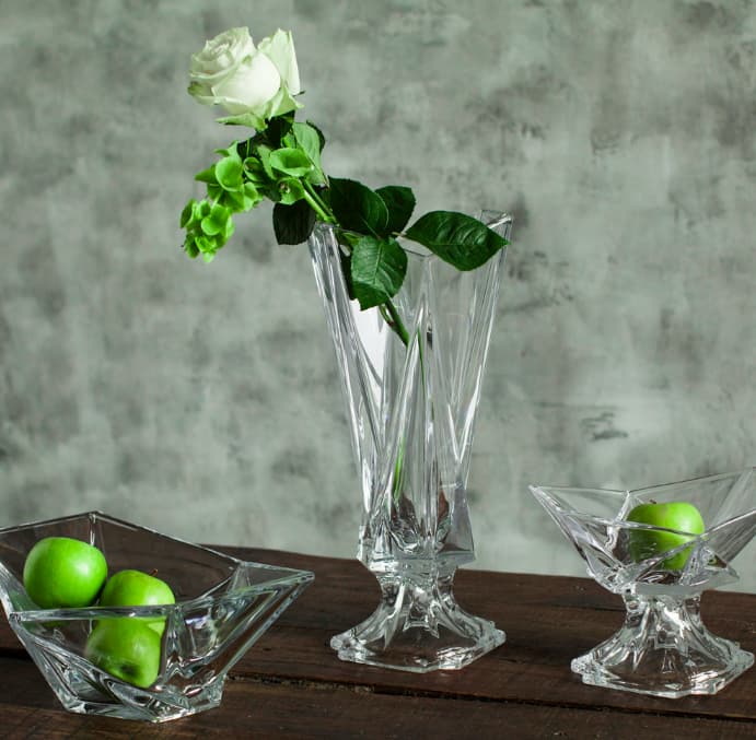 Блюдо на ножке Origami от чешского производителя Crystalite Bohemia изготовлена из богемского стекла. Обладает фигурными стенками с уплотненным дном и косыми краями. Благодаря неординарной форме сосуд будет сверкать яркими отблесками. Благодаря ненавязчивому дизайну, данная модель впишеться практически в любой стиль интерьера.