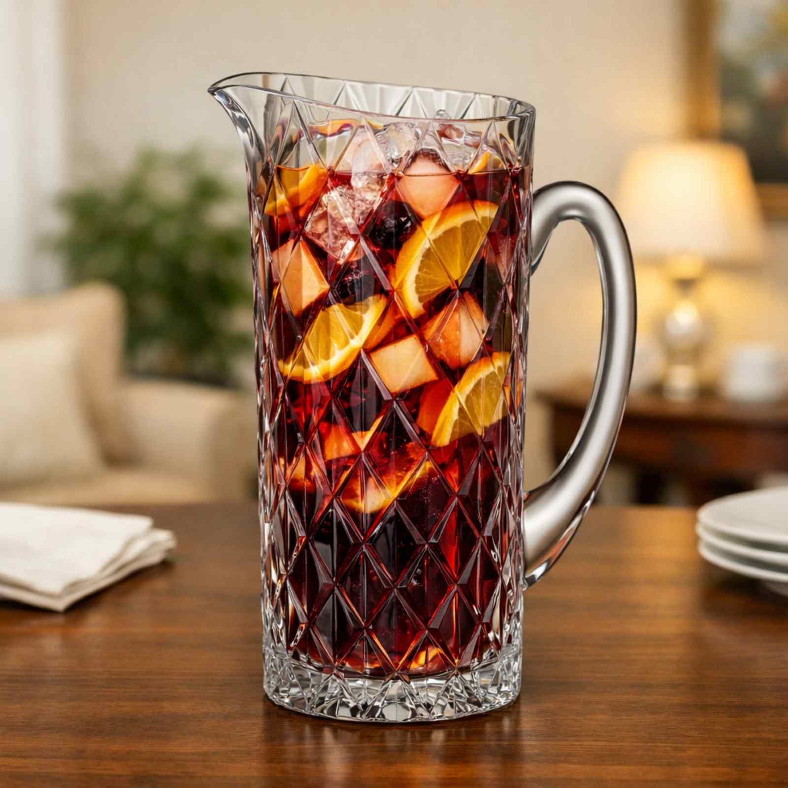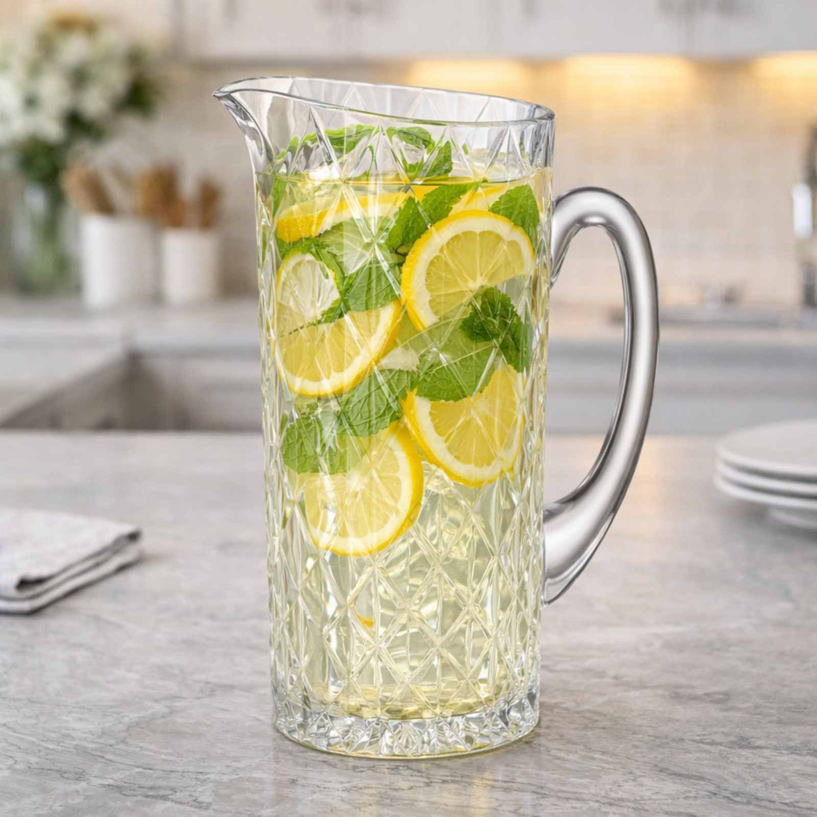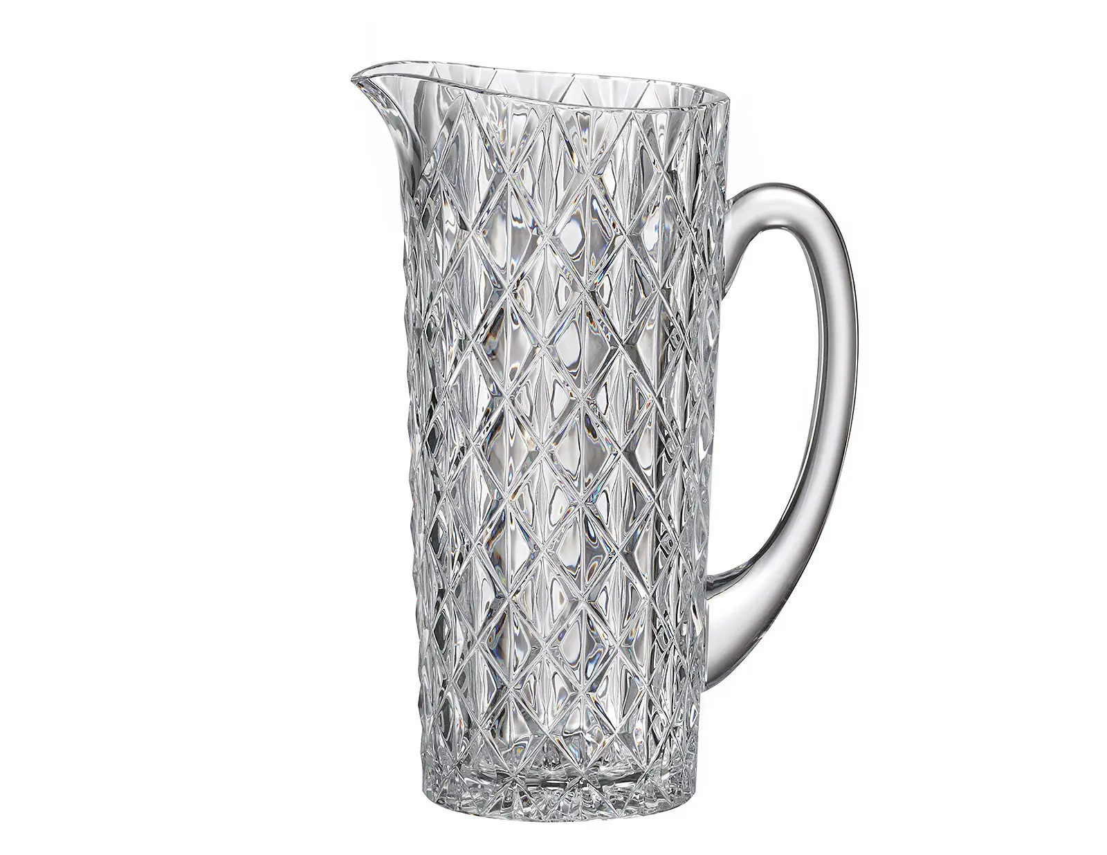 Прозрачный кувшин Memphis 1,15 л, выполненный из экохрусталя, выглядит элегантно и выразительно благодаря плотному геометрическому узору. Ромбовидные грани красиво преломляют свет, усиливая ощущение глубины и подчёркивая кристальную прозрачность изделия. Продуманная форма носика делает наливание аккуратным и удобным в любой ситуации.