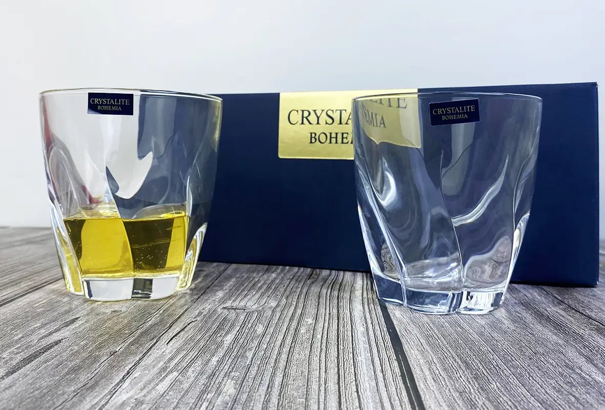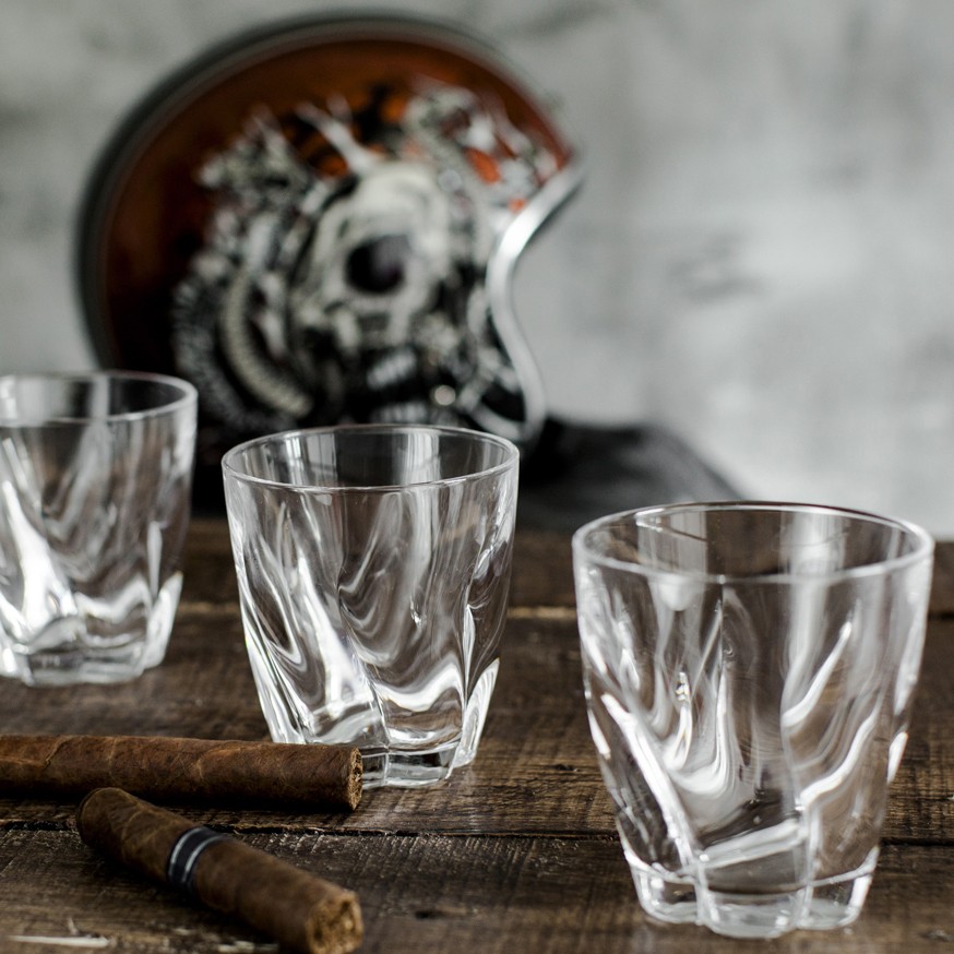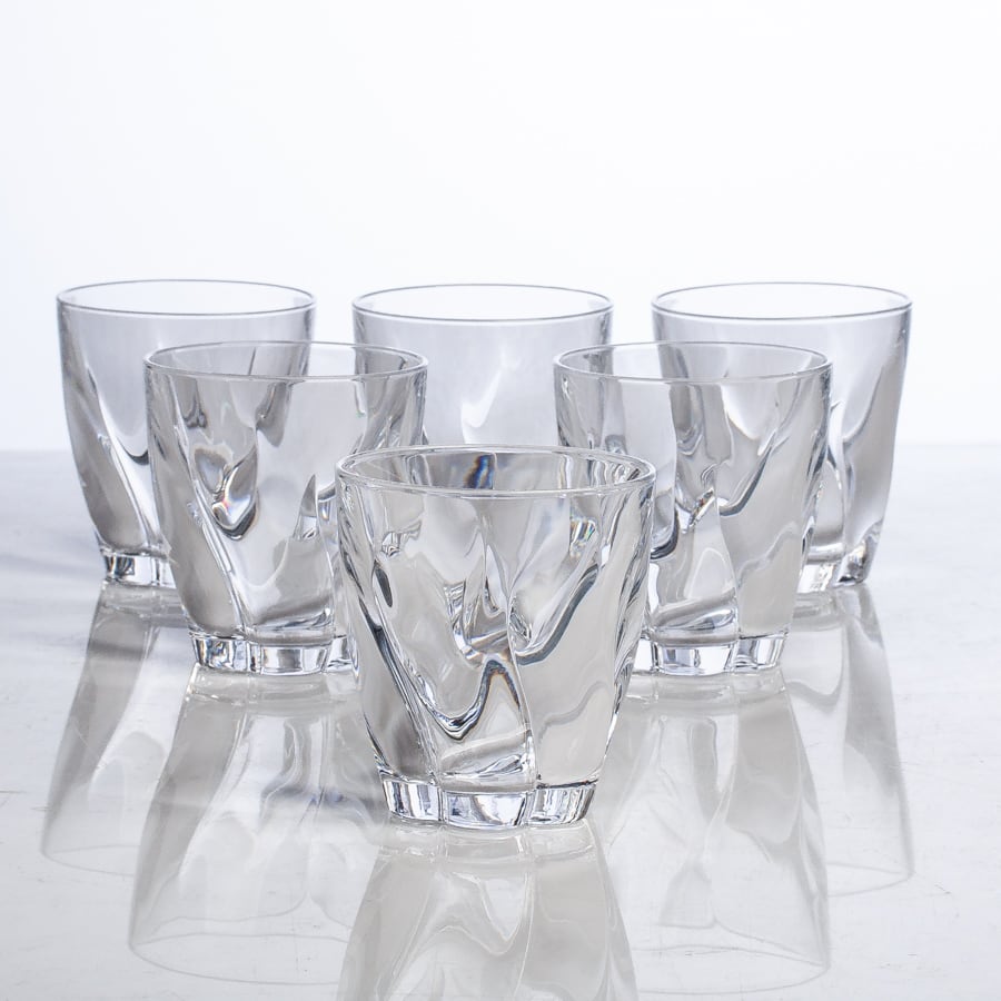 Набор стаканов «Барлей» из прессованного богемского стекла. Дизайн изделий имеет отсылку к стилю модерн с его оригинальными формами и ломаными линиями. Стаканы имеют повышенную прочность за счет окиси титана и удвоенного обжига края. Кристально чистое стекло позволяет в полной мере насладиться цветом благородного напитка, наблюдая за процессом таяния кубиков льда на утолщенной поверхности дна изделия.