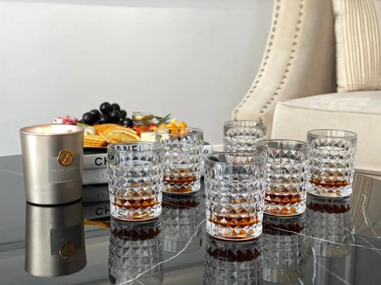 Все изделия выполнены из прочного и кристально чистого стекла, благодаря которому каждая грань сияет в отражении света. Это посуда с характером — она выглядит массивной, увесистой, подчёркивает статус и стиль. При этом универсальность форм делает её подходящей как для ежедневного использования, так и для праздничной сервировки.
