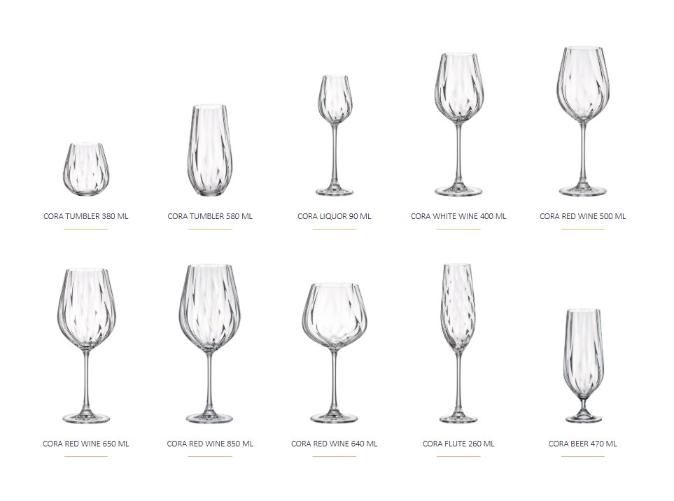 Отличительной чертой коллекции Cora является её элегантный и лаконичный дизайн. Тонкие, изящные формы и продуманные детали подчёркивают утончённость и стиль, превращая каждое изделие в настоящее произведение искусства. Бокалы имеют неширокое горлышко и тонкую ножку, что обеспечивает удобство использования и эстетическое наслаждение от сервировки.