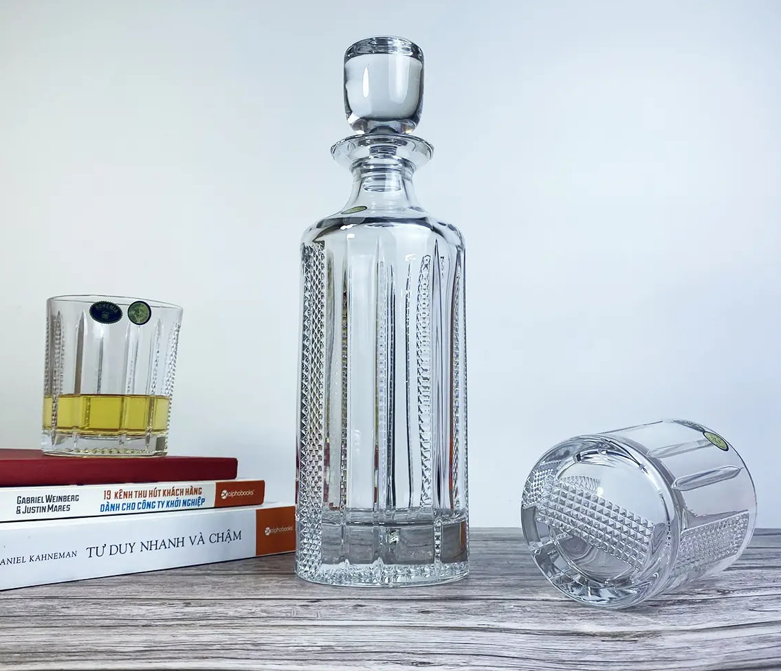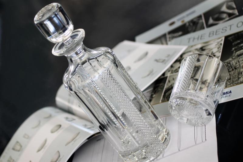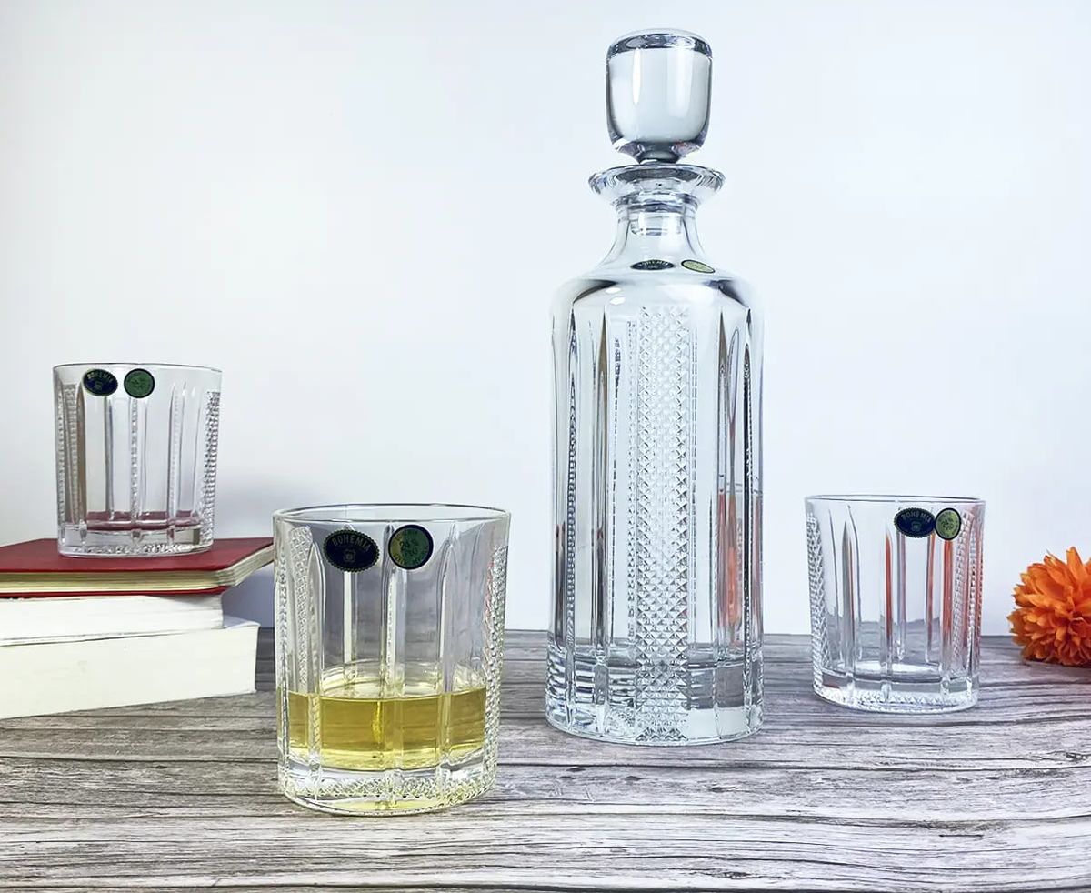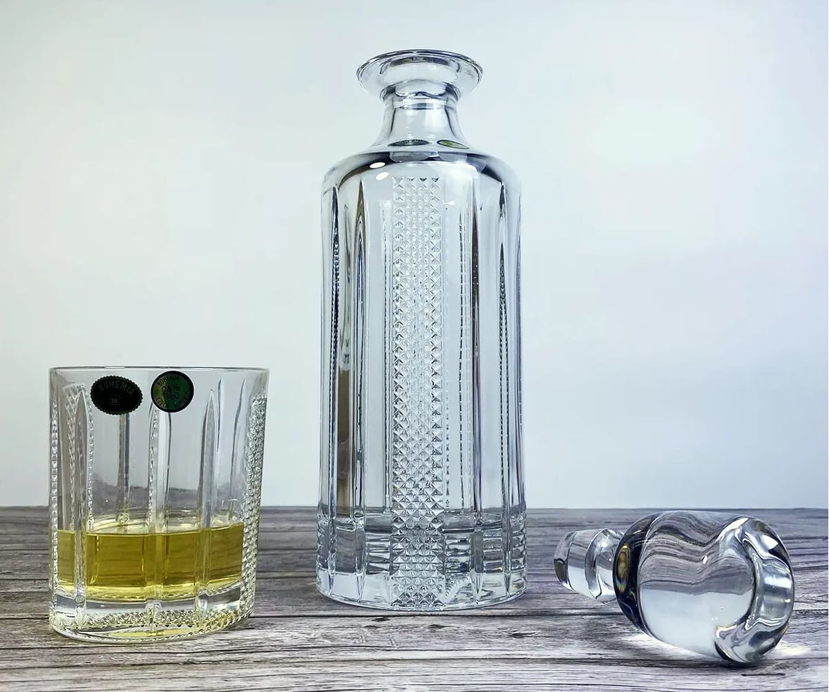 На обратной стороне стекла плотно расположенные поперечные сечения, над которыми расположены вертикальные бороздки, образующие классический традиционный узор. Набор изготовлен из традиционного хрусталя (24% PbO).