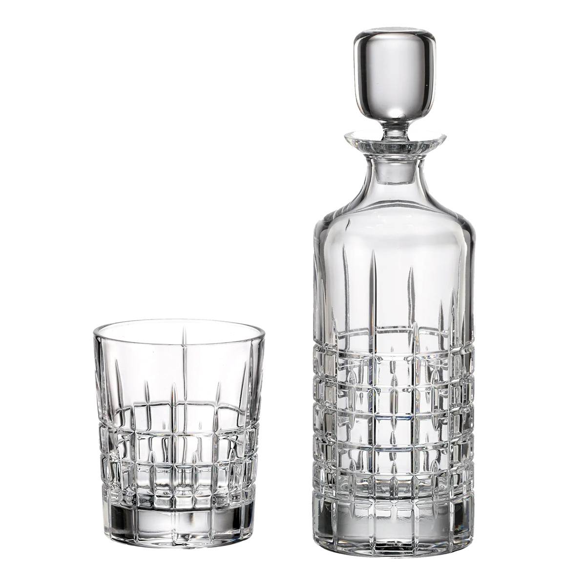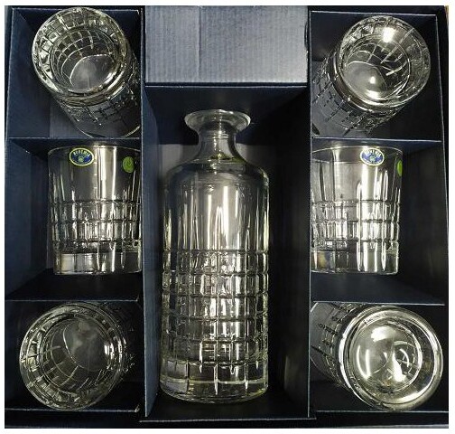 Штоф вмещает 750 мл, что делает его удобным для подачи различных напитков. Стаканы (340 мл) из комплекта выполнены в том же дизайне, что и штоф, образуя единый ансамбль. Их вес и форма продуманы так, чтобы пользоваться ими было комфортно.