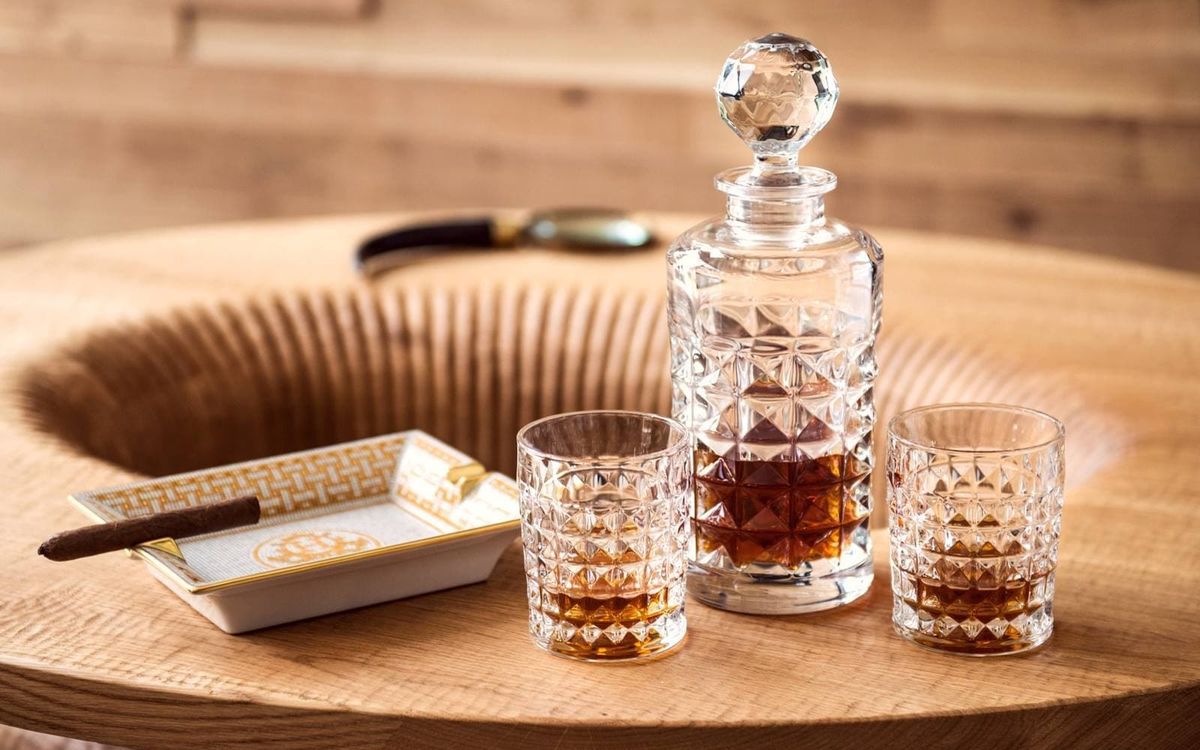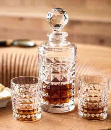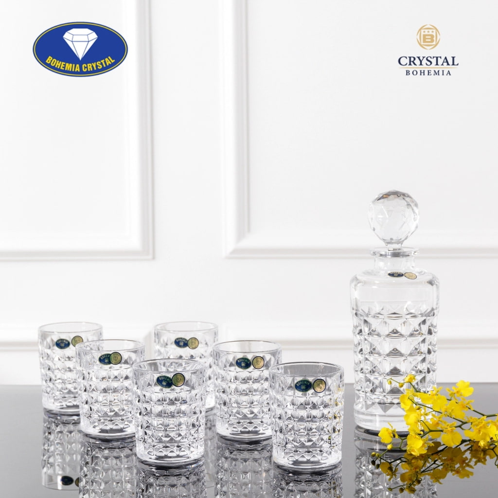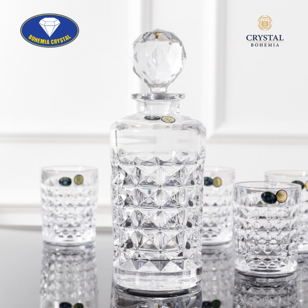 Набор для виски Diamond — это элегантное сочетание графина объёмом 700 мл и шести стаканов, выполненных из прочного богемского стекла. Объёмная геометрическая огранка красиво преломляет свет, создавая эффект многогранного блеска и подчёркивая насыщенный цвет напитков. Каждый стакан имеет удобный размер — высота 10 см и диаметр 8,1 см, благодаря чему посуда идеально подходит для виски, бурбона, коньяка и других алкогольных напитков.