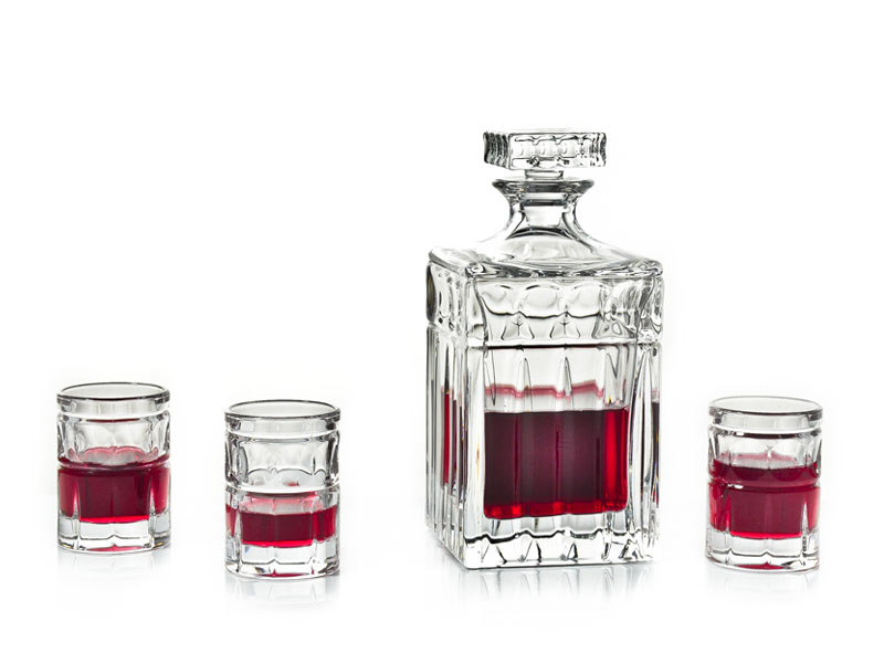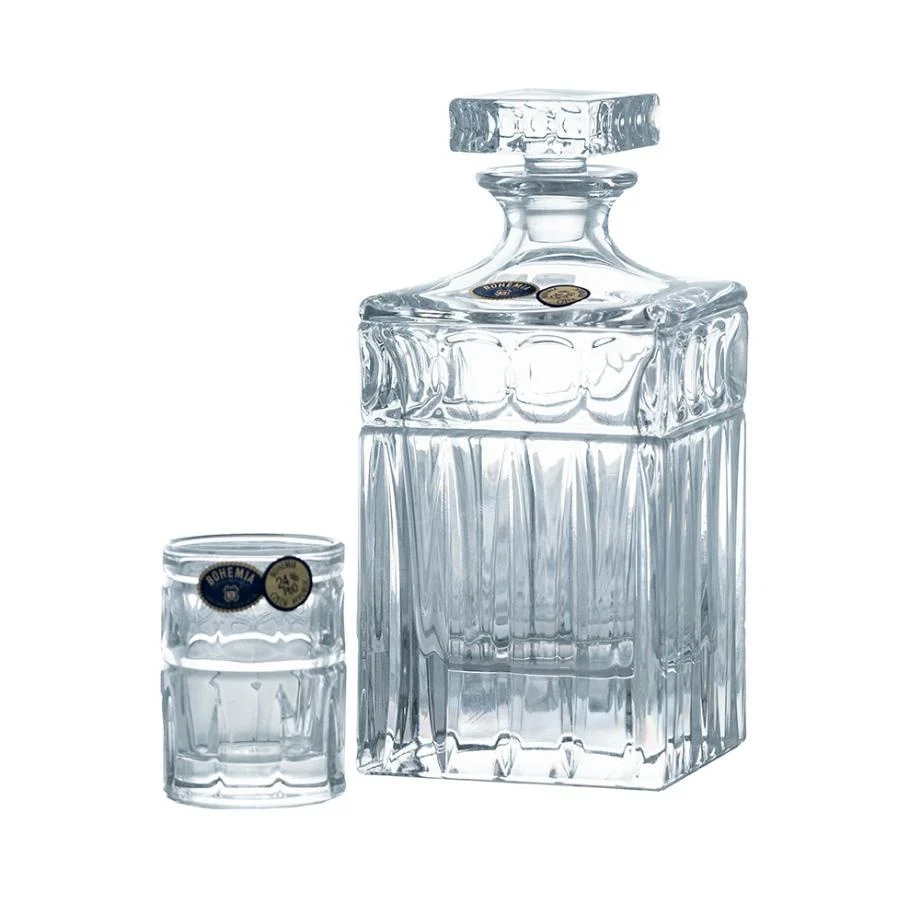 Выполненный из высококачественного богемского хрусталя, набор поражает своей прозрачностью, изысканным блеском и утонченным граненым дизайном. Графин с массивным дном и плотно прилегающей пробкой позволяет сохранить аромат и вкус напитка, а изящные рюмки подчеркивают эстетику сервировки.