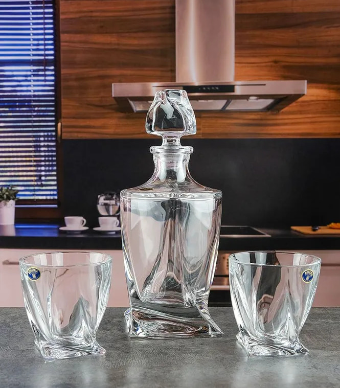 Два стакана объемом 340 мл и графин на 800 мл изготовлены из высококачественного чешского хрусталя, отличающегося удивительной прочностью и хрустальной прозрачностью.