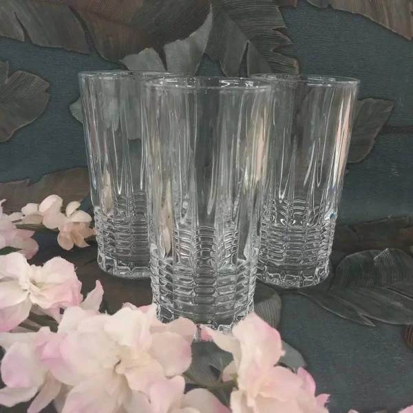 Нижняя часть стаканов украшена плотным рельефом, напоминающим сетку или пересечение граней. Это не только усиливает игру света и тени, но и добавляет стаканам устойчивости и надёжности.