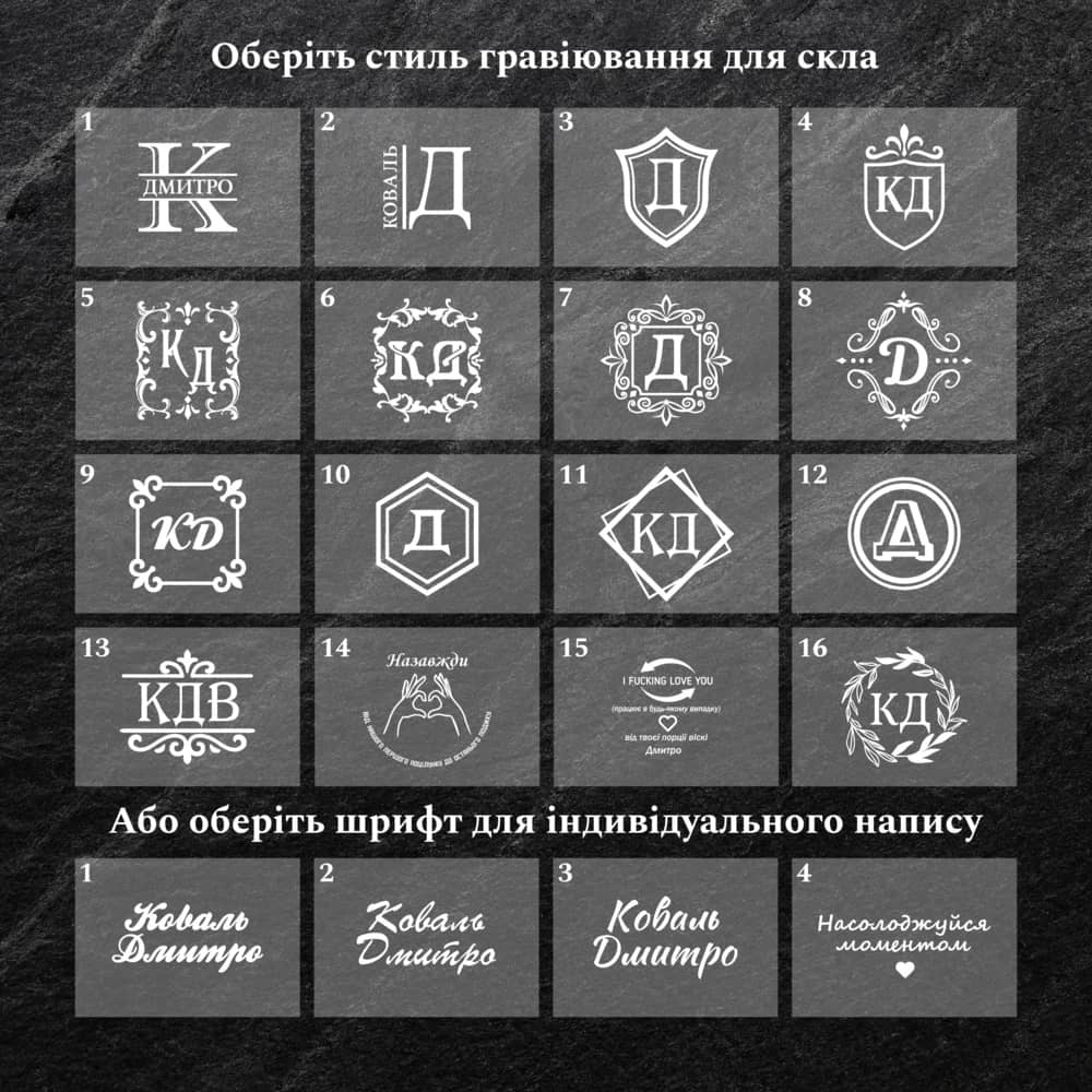Выбирая гравировку, обратите внимание на последние фото в ленте — это пронумерованные макеты, которые можно выбрать для гравировки на вашем наборе. При оформлении заказа оставьте, пожалуйста, комментарий с номером выбранного дизайна — и ваш подарок будет завершён штрихом персональной роскоши.