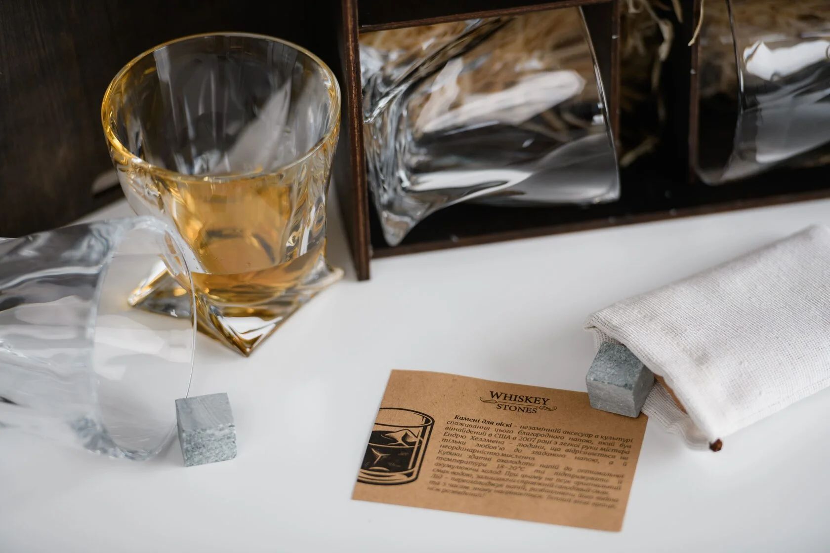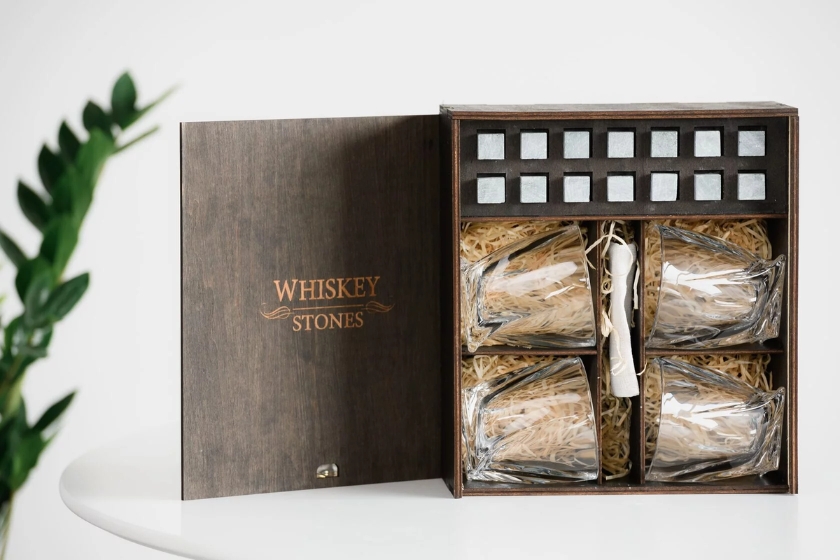 — Индивидуальная гравировка: без гравировки / на камнях / на крышке коробки / на камнях и крышке / на камнях, крышке и стаканах / на камнях, крышке, стаканах и подставках