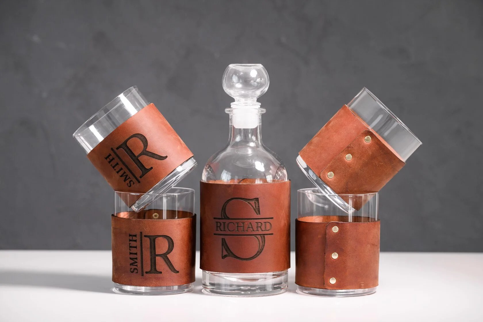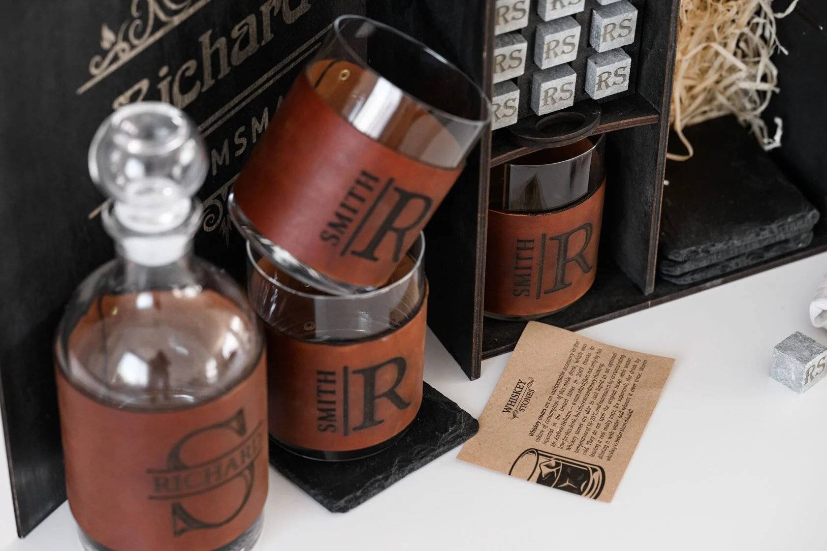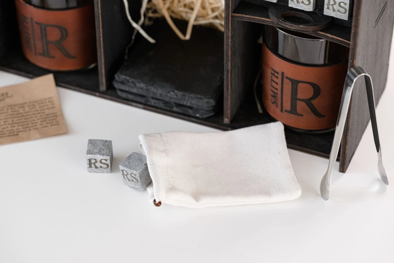 Премиальный подарок для ценителей — набор № 8 Larus сочетает в себе эстетику и функциональность. Четыре стакана для виски с кожаными съёмными футлярами, эффектный графин, охлаждающие камни и изящные аксессуары — всё для стильной дегустации.