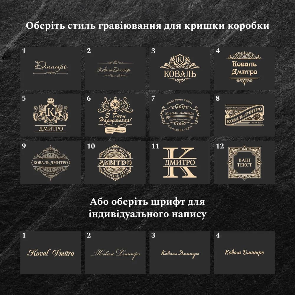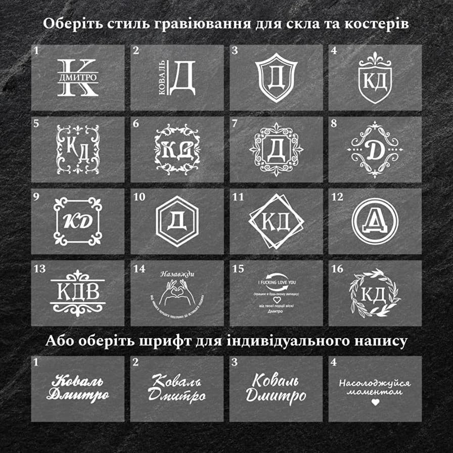 Выбирая гравировку, обратите внимание на последние фото в ленте — это пронумерованные макеты, которые можно выбрать для гравировки на вашем наборе. При оформлении заказа оставьте, пожалуйста, комментарий с номером выбранного дизайна — и ваш подарок будет завершён штрихом персональной роскоши.