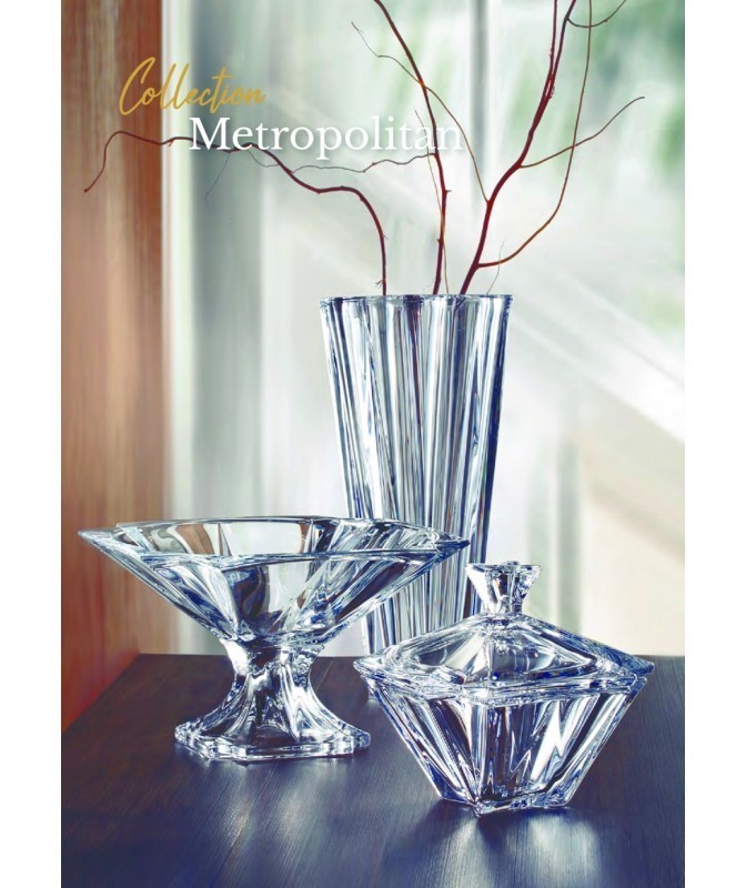 Коллекция Bohemia Metropolitan создана для ценителей выразительного дизайна и строгой элегантности. Все изделия в этой серии — от ваз до сервировочных блюд — выполнены из прозрачного хрусталя с геометрическим рельефом. Многогранные грани и чёткие линии придают формам архитектурную чёткость и делают их визуально привлекательными с любого ракурса.