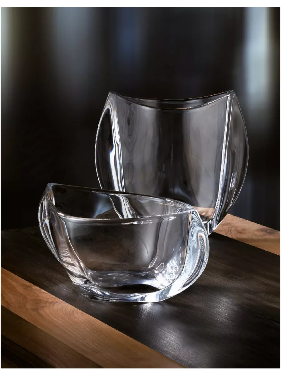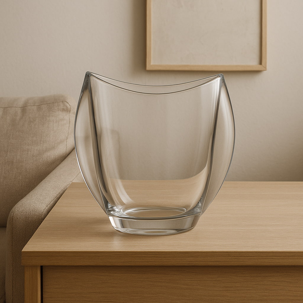 Благодаря высокой прозрачности экохрусталя ваза эффектно преломляет свет, создавая игру бликов и визуальной глубины. Отсутствие свинца делает материал экологически безопасным и при этом сохраняет его блеск и прочность. Устойчивое основание и сбалансированная форма делают изделие удобным в повседневном использовании.
