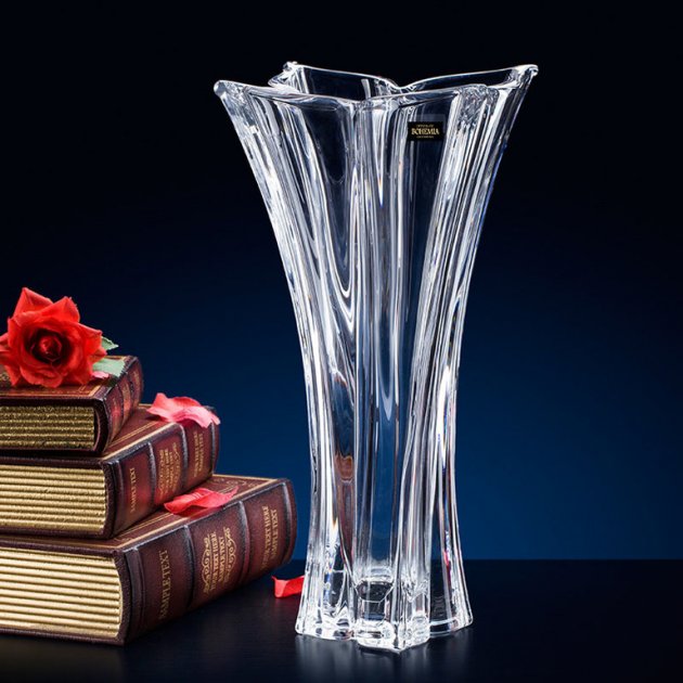 Чешское стекло премиального качества — прозрачное, блестящее и долговечное. Выполнена из из хрустального стекла “Crystalex” в состав этого стекла входят минералы, благодаря которым, лучи света, попадая на вазу, предают ей особый блеск и вид, при этом сохраняя 100% прозрачность