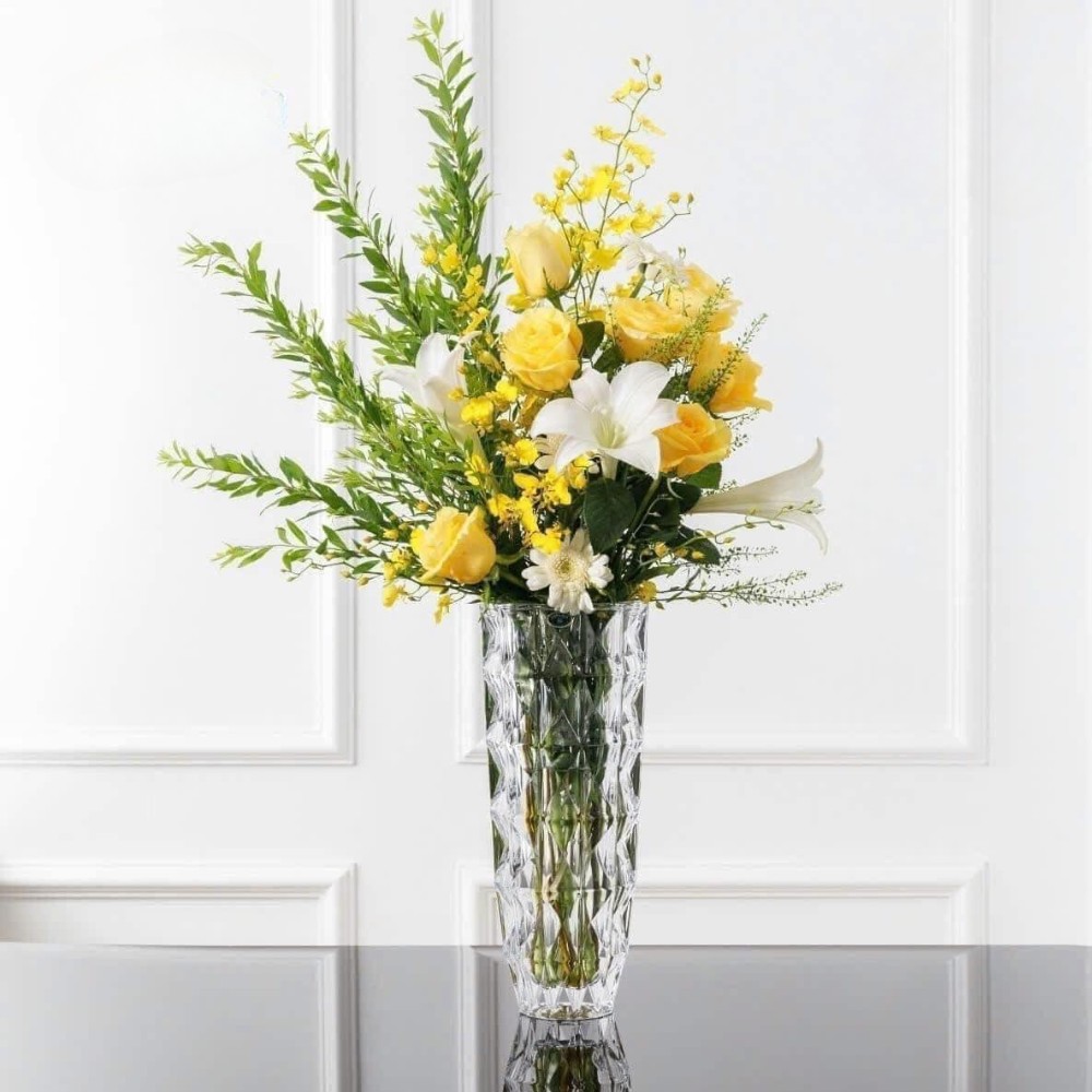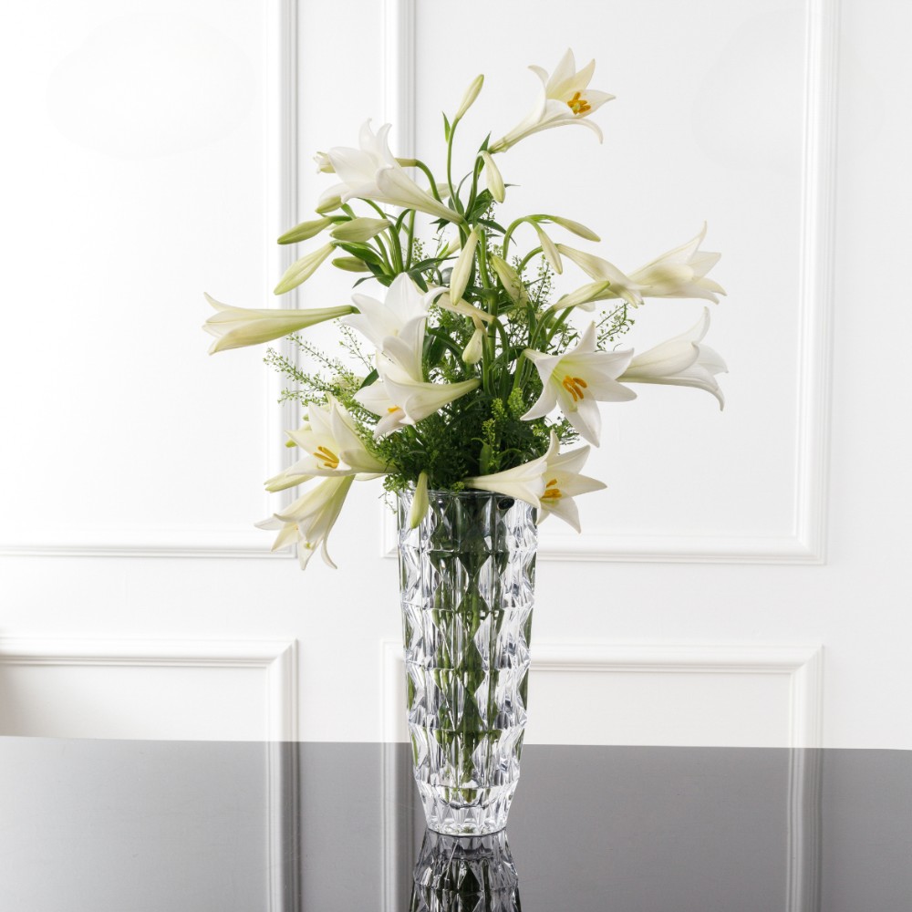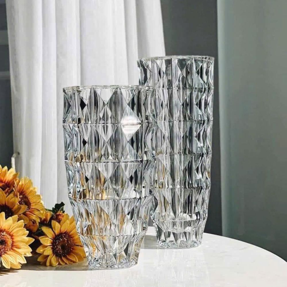 Модель высотой 25,5 см гармонично подойдёт для небольших букетов или сухоцветов, а также эффектно смотрится даже без наполнения. Ваза 33 см рассчитана на крупные цветочные композиции и станет центром внимания в гостиной, зале или на торжественном столе. Обе формы отличаются устойчивым основанием и прочным хрусталем, что гарантирует комфорт в использовании.
